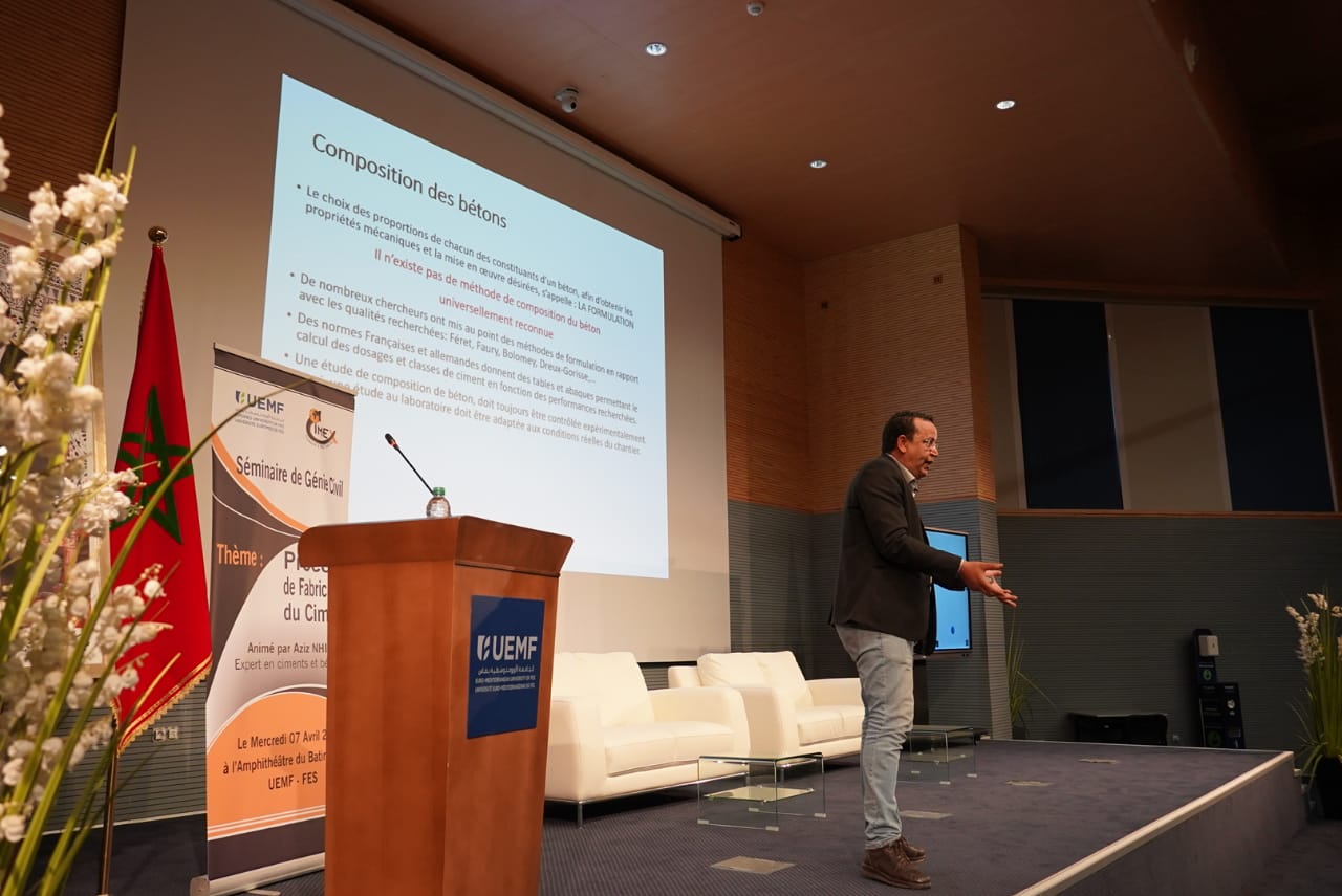 Dans le cadre des séminaires organisés par l'Université Euromed de Fès, les étudiants de génie civil de l'Euromed Institute of Technology ont assisté à un séminaire sur le procédé de fabrication du ciment, présenté par M. Aziz NHIR, Directeur Général de l'entreprise CIMEX et expert en ciments et bétons (Matériaux et Procédés).