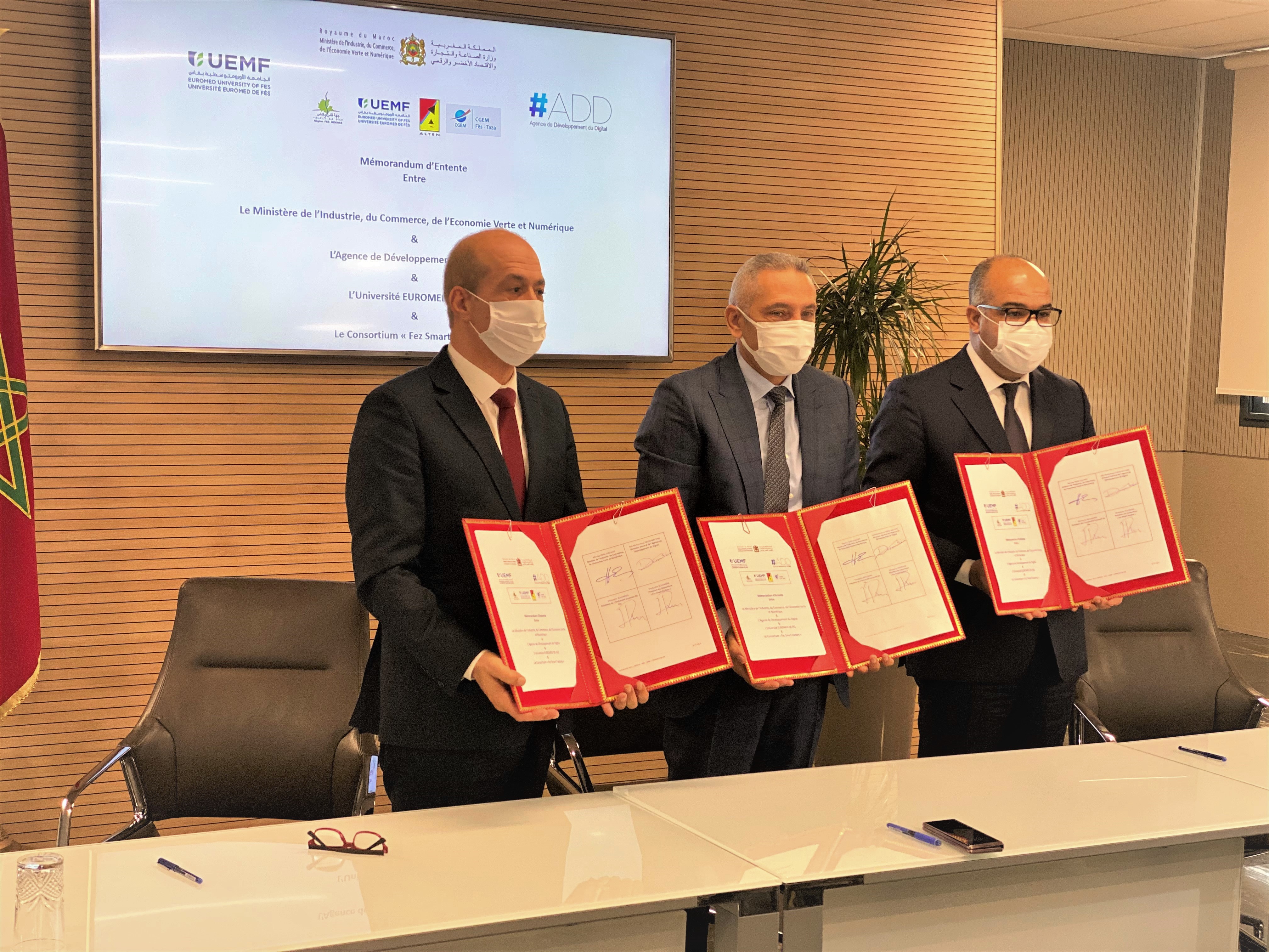 Un mémorandum d'entente entre l'université Euromed de Fès et le Consortium du projet Fez Smart Factory, d'une part, et le Ministère de l'industrie, du Commerce et de l'économie Verte et Numérique, et l'Agence de Développent du Digital, d'autre par