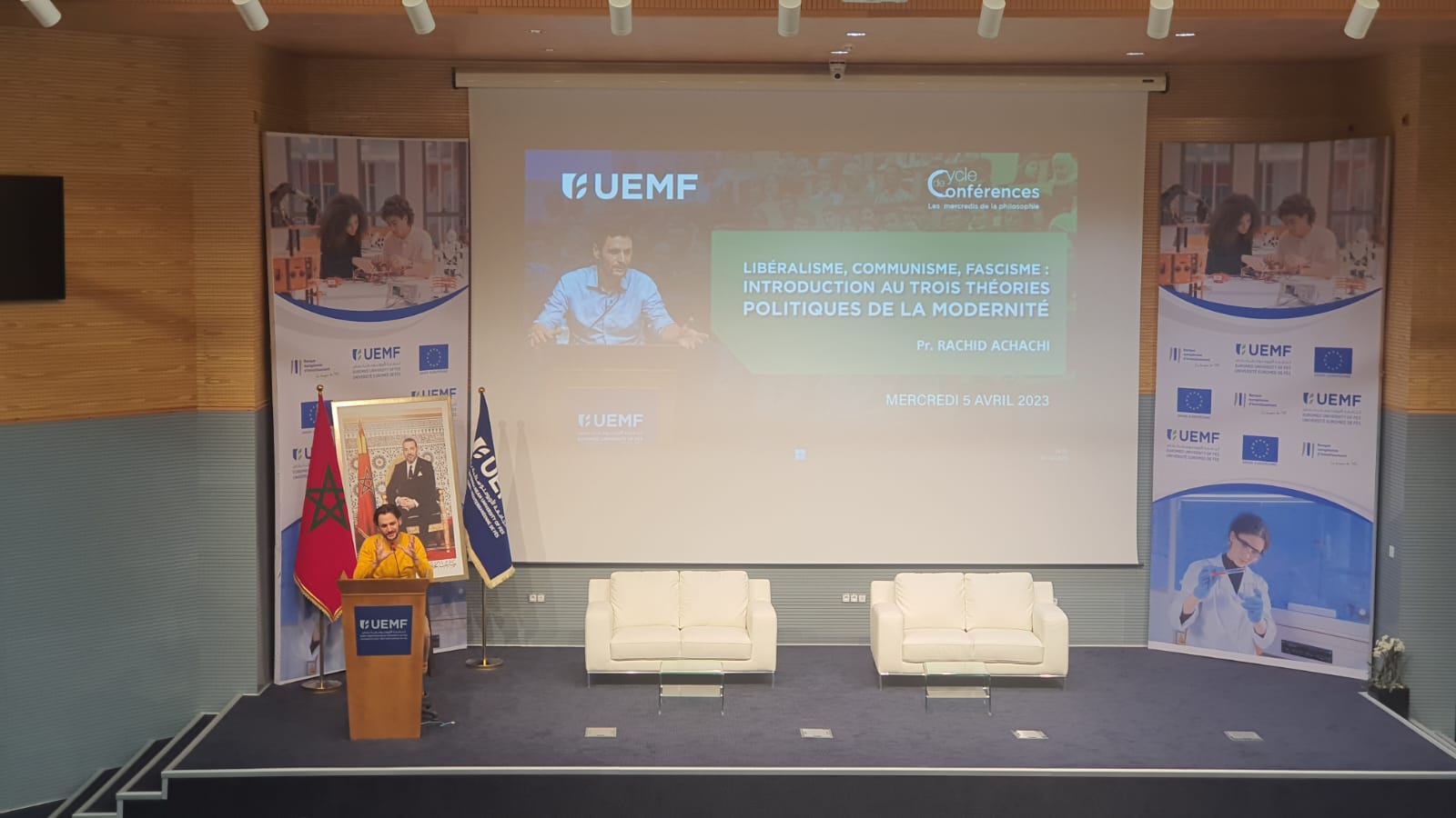 Rachid Achachi continue avec son cycle de conférences à l'Université Euromed de Fès en animant, le 05 avril 2023, une conférence intitulée : "Libéralisme, communisme, fascisme : introduction au trois théories