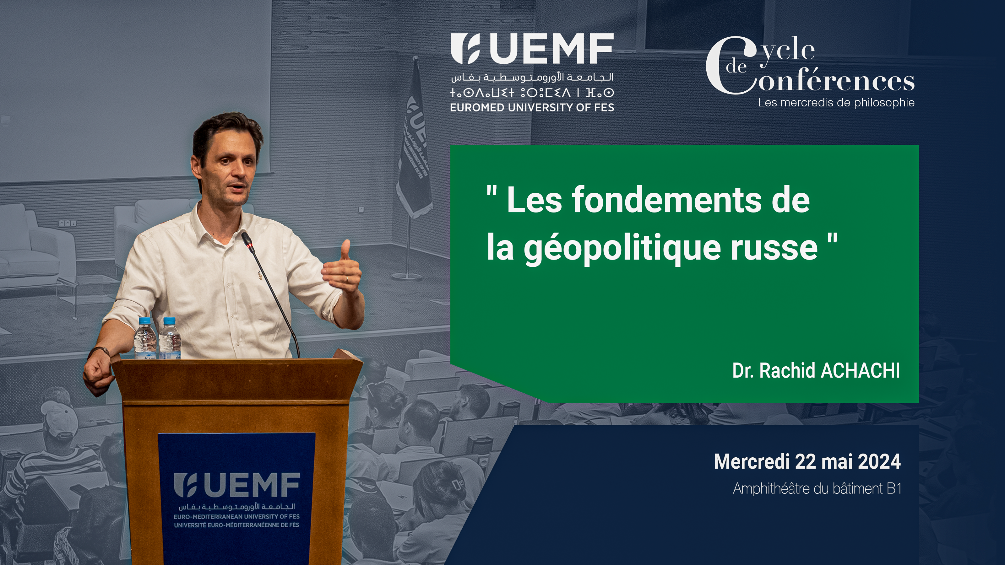 Le conférencier Dr. ACHACHI, a de nouveau animé dans le cadre des mercredis de la philosophie ; une conférence de grande envergure portant sur la géopolitique Russe au sein de l’éco-campus de l’Université Euromed de Fès le 22 mai 2024.